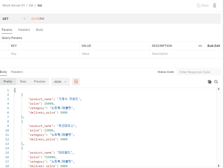 Mock Server01 하위에 'list' 라는 이름으로 API Example를 추가한다.