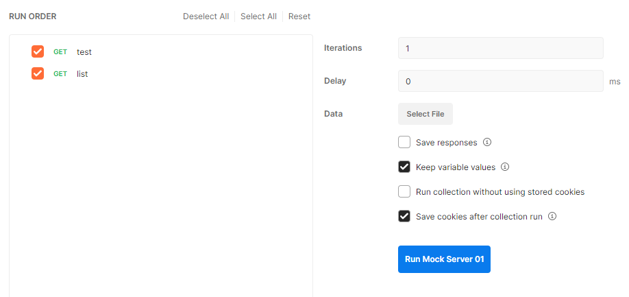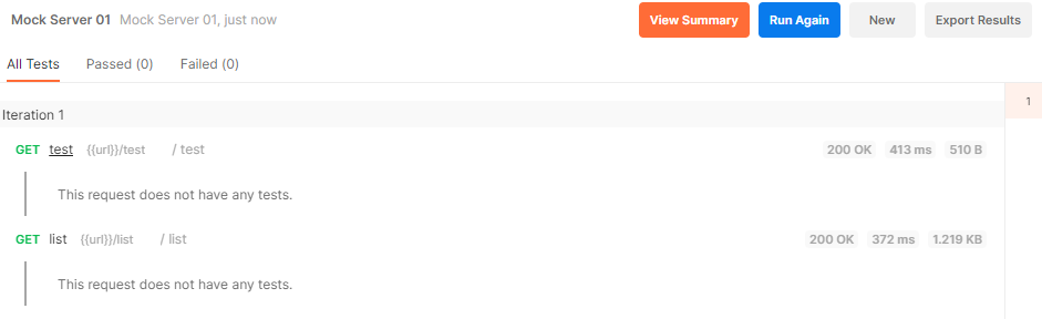 Run Mock Server 01 버튼을 클릭하면 Mock 서버가 실행되고, 아래와 같이 test, list 2개의 API가 초록색으로 활성화된 것을 확인할 수 있다.