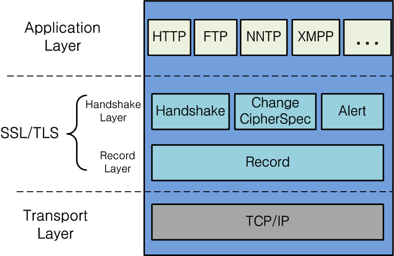 - 통신 과정에서 모든 정보가 그대로 노출되는 보안 취약점이 발견되었고, 이로 인해 통신 과정에도 응용 계층의 데이터를 암호화할 필요성이 생기면서 보안을 위한 레이어 SSL(Secure Sockets Layer, 현재는 TLS라는 명칭으로도 사용)가 생겼다. 이 레이어는 응용 계층과 전송 계층 사이에 존재한다.