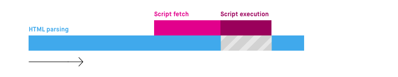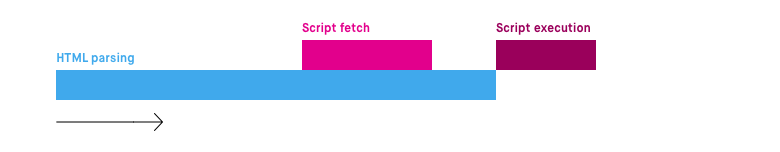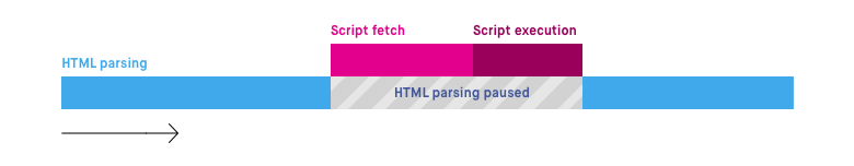 이처럼 HTML 파싱과 외부 자바스크립트 파일의 로드가 비동기적으로 동시에 진행된다. 하지만 자바스크립트 파싱과 실행은 자바스크립트 파일 로드가 완료된 직후에 진행되며 이때 HTML 파싱이 중단된다.